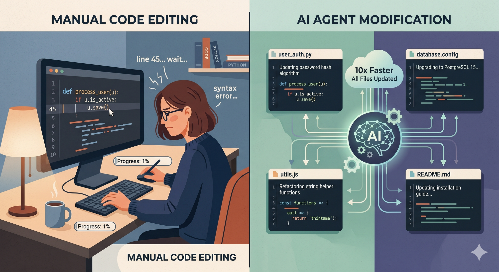 2단계: AI에게 “버튼 컴포넌트의 색상을 변경해줘”라고 요청하면 해당 파일 하나를 수정하는 코드를 제안합니다. 이제 남은 수십 개의 파일은 개발자가 직접 찾아서 하나씩 반복해야 합니다.
