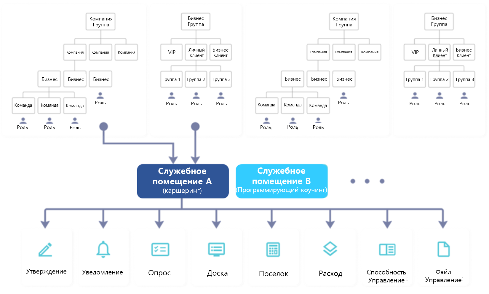 Платформа предоставляет возможность обслуживать всю группу компаний, отделов и команд с помощью одного приложения. Она предлагает эффективное распределение ресурсов в многопользовательской среде, а также высокий уровень безопасности через логическую изоляцию.