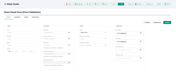 Bundan tashqari, asosiy UI komponentlar ham qo‘shildi: buttonlar, form elementlar (Input, Select, DatePicker), checkbox va radio buttonlar. Har biri turli holatlarda (Default, Hover, Disabled, Error) ko‘rsatilib, class nomlari va markup strukturalari aniq belgilandi.