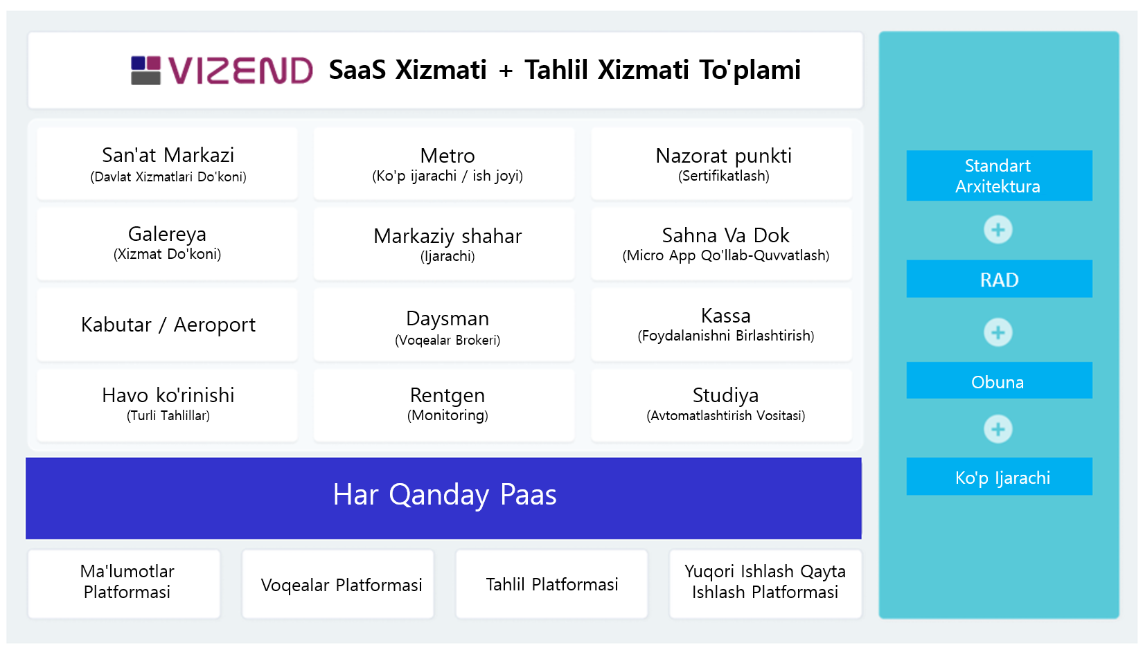 VIZEND MSP "Obuna bo‘ladigan ilovani yaratish" maqsadiga erishish uchun rivojlanish va operatsiyalarning barcha sohalarini qo‘llab-quvvatlaydi.
